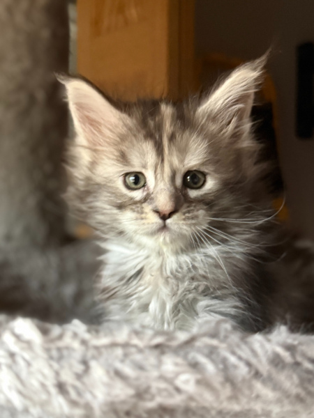 A rare beauty, this silver smoke Maine Coon kitten carries a misty, ethereal look—dark outer fur that parts to reveal brilliant silver with every movement. Playful yet poised, she adores exploring new spaces and cuddling close once she’s done adventuring. She’s as enchanting in personality as she is in appearance.
